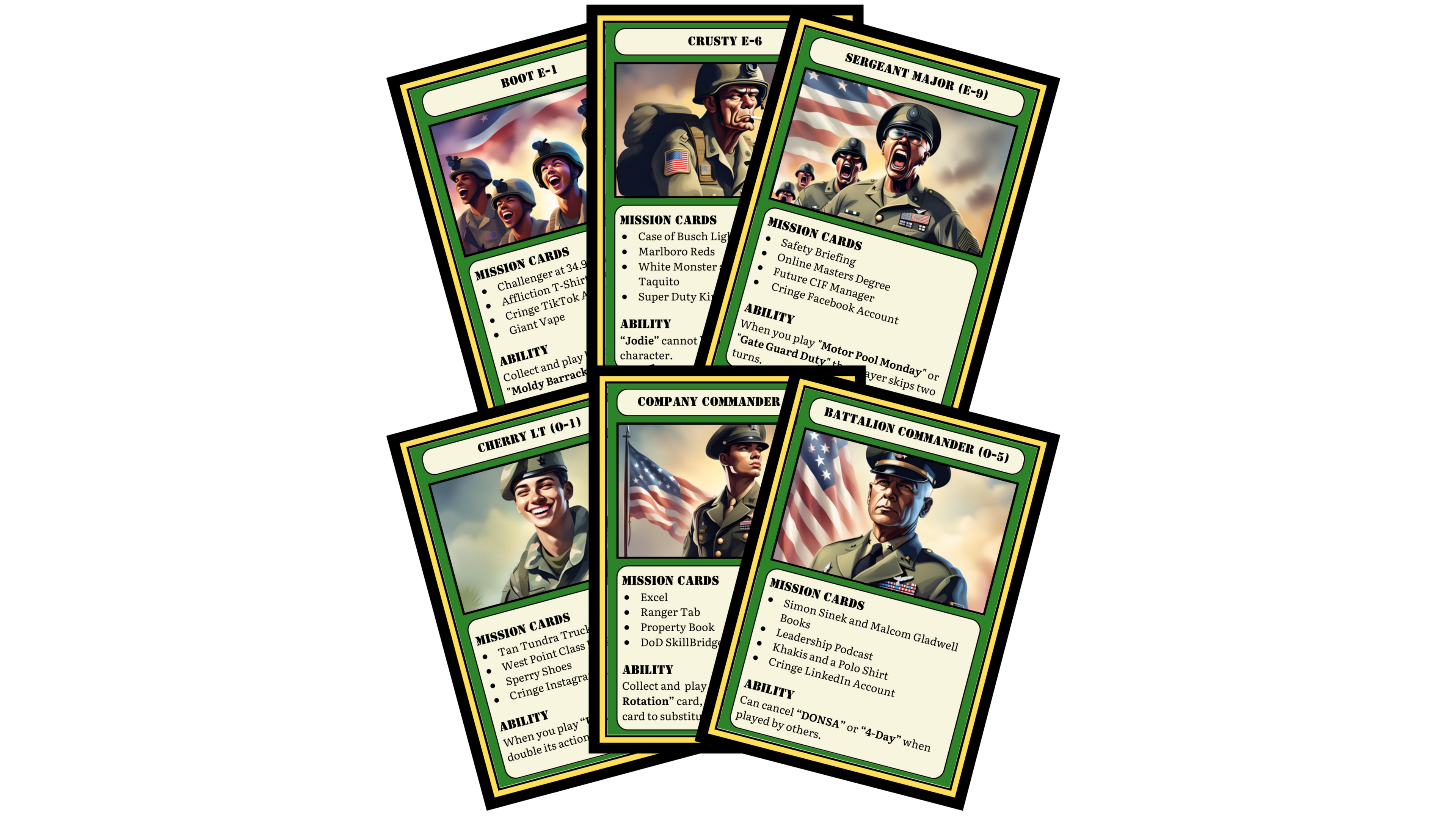 Zonk is the first of its kind Army card game. Players draw a character, each with their own mission, to collect four specific cards. Action cards mean players can draw, steal, and skip - based on real life, jokes, memes, and Armyisms we've all experienced.